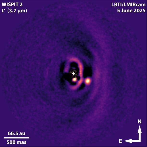“It’s a bit like what our own Jupiter and Saturn would have looked like when they were 5,000 times younger than they are now,” Weible said. “The planets in the WISPIT-2 system appear to be about 10 times more massive than our own gas giants and more spread out. But the overall appearance is likely not so different from what a nearby ‘alien astronomer’ could have seen in a ‘baby picture’ of our solar system taken 4.5 billion years ago.”