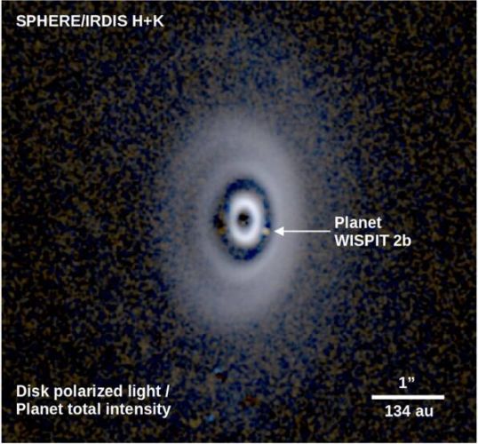 Shown here is a SPHERE/IRDIS multiband image of the WISPIT 2 system. Theย H-bandย Qฯย image was added as the blue channel and the median combination ofย H-band andย Ks-bandย Qฯย images was added as the green channel. The red channel is a combination of aย Ks-bandย Qฯย image and aย Ks-band cADI image in which we masked all but the gap containing the thermal emission from WISPIT 2b.