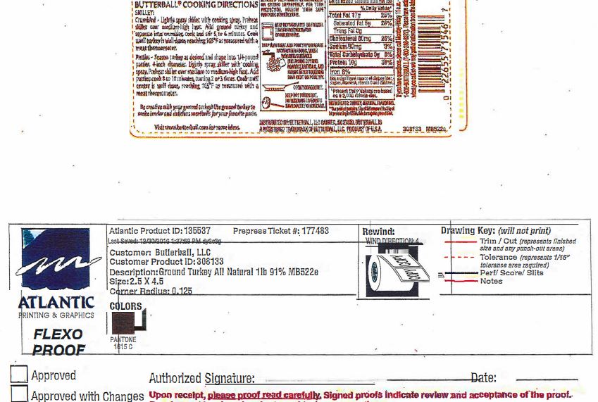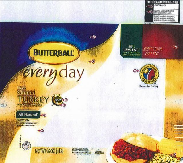 • 16-oz. plastic wrapped tray containing “BUTTERBALL everyday Fresh Ground Turkey WITH NATURAL FLAVORING (85% LEAN/15% FAT)” with sell or freeze by date of 7/26/18, lot code 8188 and UPC code 22655-71546 represented on the label.