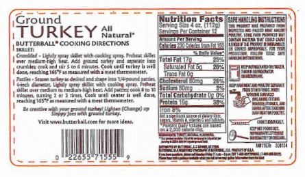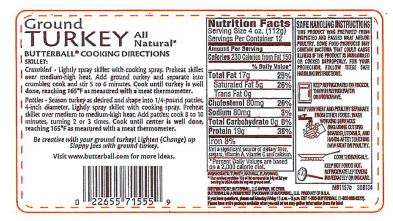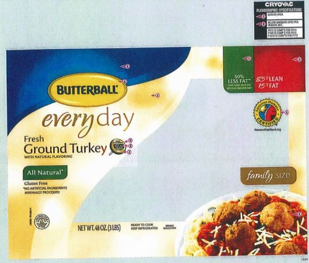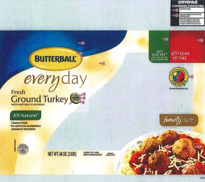 • 48-oz. plastic wrapped tray containing “BUTTERBALL everyday Fresh Ground Turkey WITH NATURAL FLAVORING (85% LEAN/15% FAT)” with sell or freeze by date of 7/26/18, lot code 8188, and UPC codes 22655-71555 or 22655-71557 represented on the label.