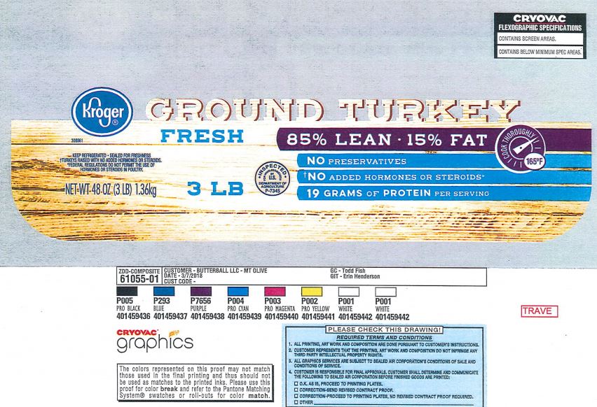 • 48-oz. plastic wrapped tray containing “Kroger GROUND TURKEY FRESH 85% LEAN – 15% FAT” with sell or freeze by date of 7/26/18, lot code 8188, and UPC code 111141097993 represented on the label.