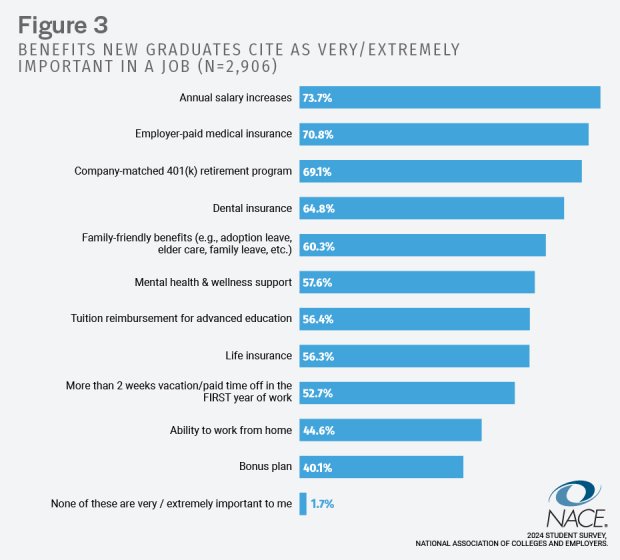 “A practical consideration for employers is that although a high starting salary fell lower on their wish list, students were clear that salary and benefits matter. For one thing, they expect organizations to be up front about their compensation page. Moreover, they look for annual salary increases,” says Shawn VanDerziel, NACE president and chief executive officer.