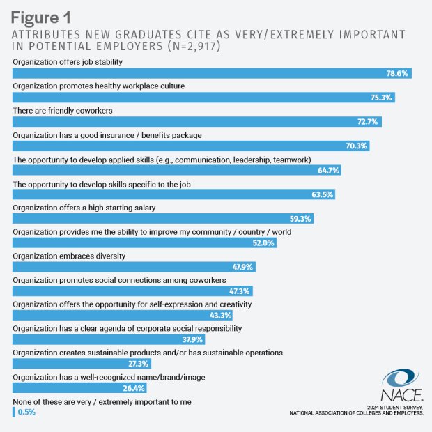 What does the Class of 2025 want most in a job? Stability, according to the annual student survey conducted by the National Association of Colleges and Employers (NACE).