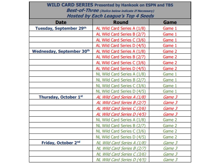 Yesterday, Major League Baseball released their schedule for the 2020 Postseason, which is set to open with the American League’s inaugural Wild Card Series on Tuesday, September 29 and the National League’s first Wild Card Series openers on Wednesday, September 30.