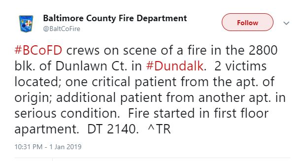 The Baltimore County Fire Department released word today that a 59-year-old woman died in a one-alarm, New Year’s Day apartment fire in Dundalk, Maryland. According to officials, Lillian Lyman Lindeman, of the 2800 block of Dunlawn Ct., was pronounced dead at the scene by BCoFD EMS personnel after repeated attempts to revive her were unsuccessful.