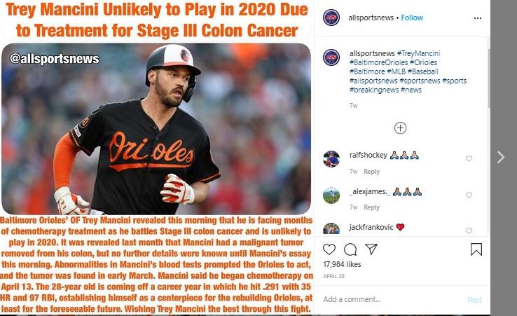 Mancini, 28, was diagnosed with Stage III colon cancer in March. The Notre Dame alumnus and Central Florida native was drafted by the Orioles in the eighth round of the 2013 First-Year Player Draft and made his Major League debut in September of 2016.