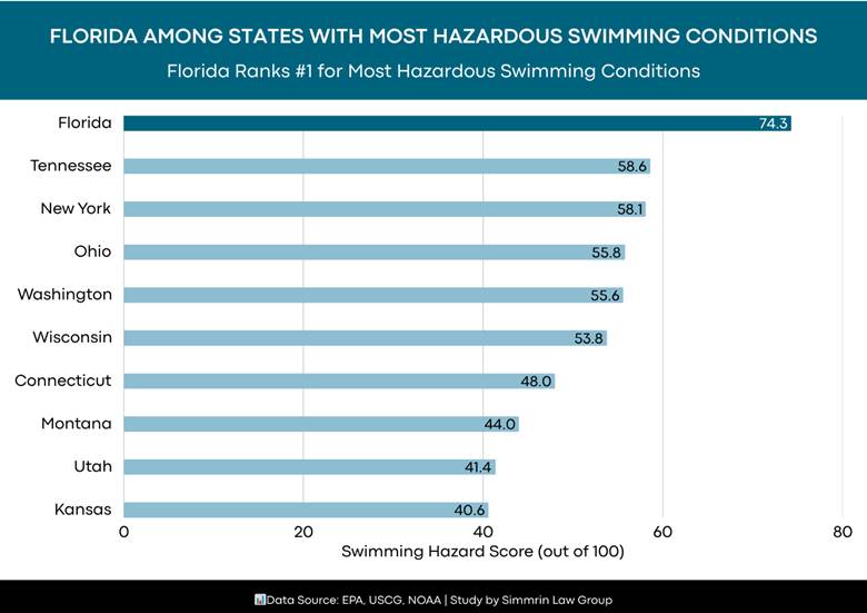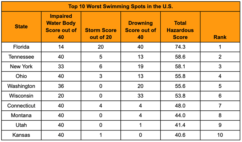 The Sunshine State of Florida, known for its many popular beaches and swimming vacation spots, ranks highest among the most hazardous swimming spots based on water quality, storm frequency, and drowning incidents.