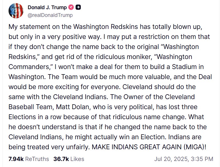 Trump reignited the name change controversy by threatening to block the Washington Commanders’ stadium deal unless the team reverted to its former name. He posted on Truth Social that “there is a big clamoring for this,” claiming that “our great Indian people, in massive numbers, want this to happen”.