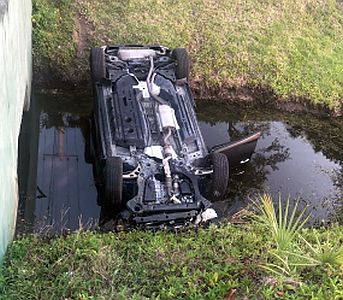 Upside down in the canal was a black Nissan Murano that was partially submerged in water. Deputy Barcaro immediately jumped into the canal in waist deep water and went to the driverโs side door. Another bystander was already in the water. The deputy observed the bystander trying to open the passenger side door.